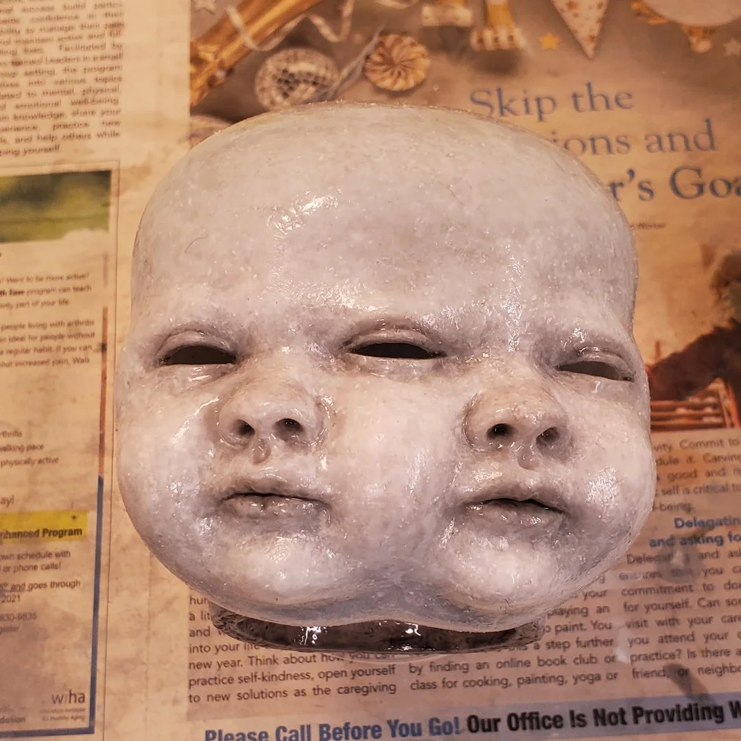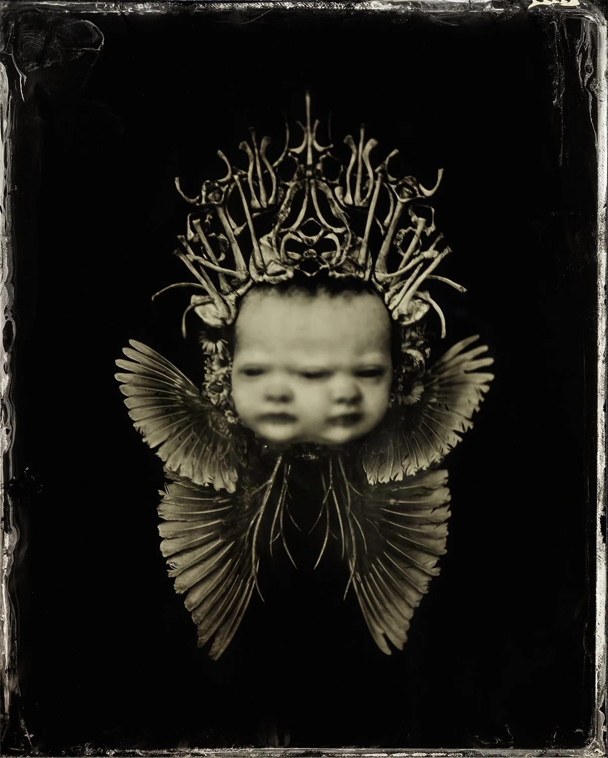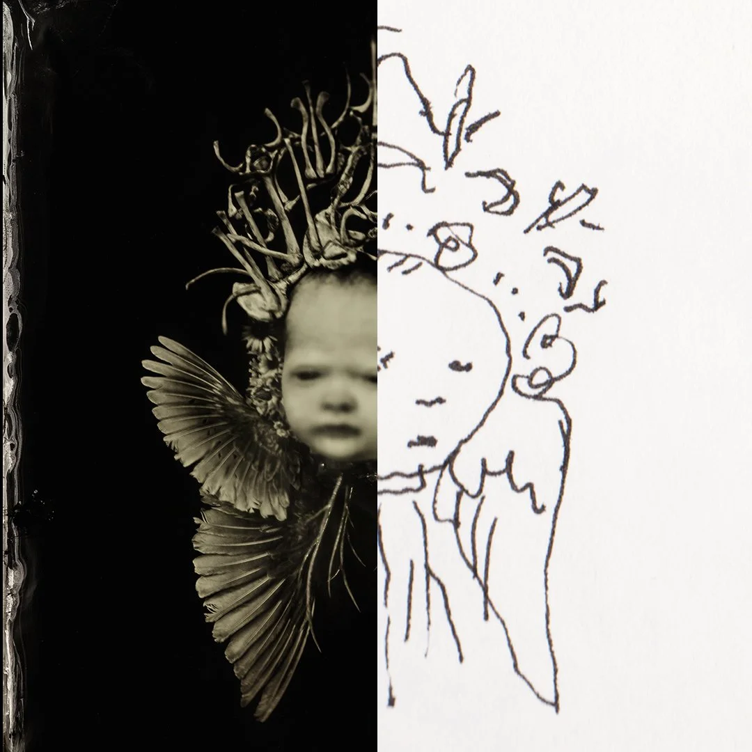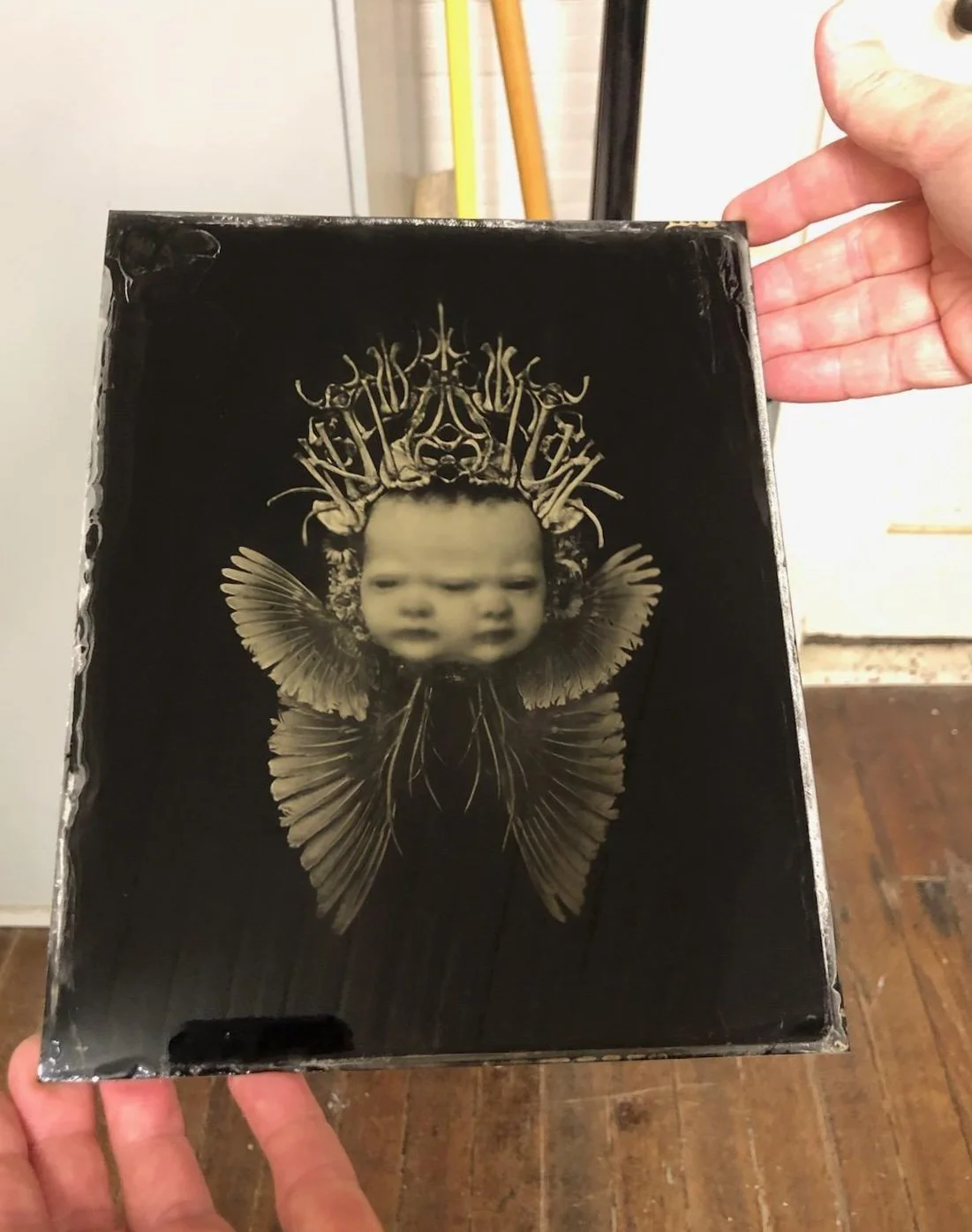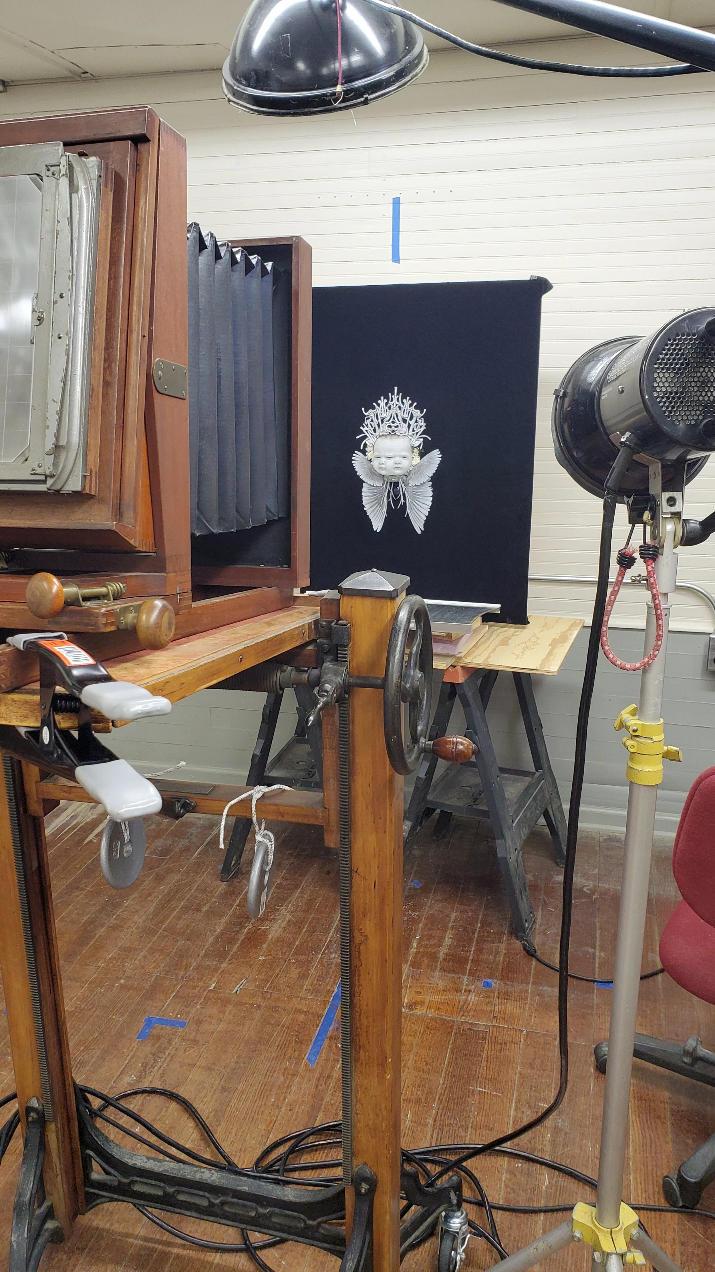 As it sometimes goes with making art, the first attempt sometimes doesn’t work. An earlier version of this sculpture was made in 2022, and in 2023 I attempted to make a tintype of it with the help of Eric Baillies, who was showing me wet collodion techniques at the time. I was never really satisfied with the sculpture and the tintype never quite came together. The sculpture was set aside in a corner of my studio and the tintypes from that session were never shared. Time was needed to rethink the sculpture and practice my skills making tintypes. I approached the sculpture a little differently in 2025 when I was asked to do the branding and illustrations for the 2025 Dark Days Bright Nights music festival in Richmond, VA. After a new round of sketching, I began working on the sculpture again, this time with better results. I hope you enjoy seeing how the tintype Crowned Diprosopus in Ascension was made.