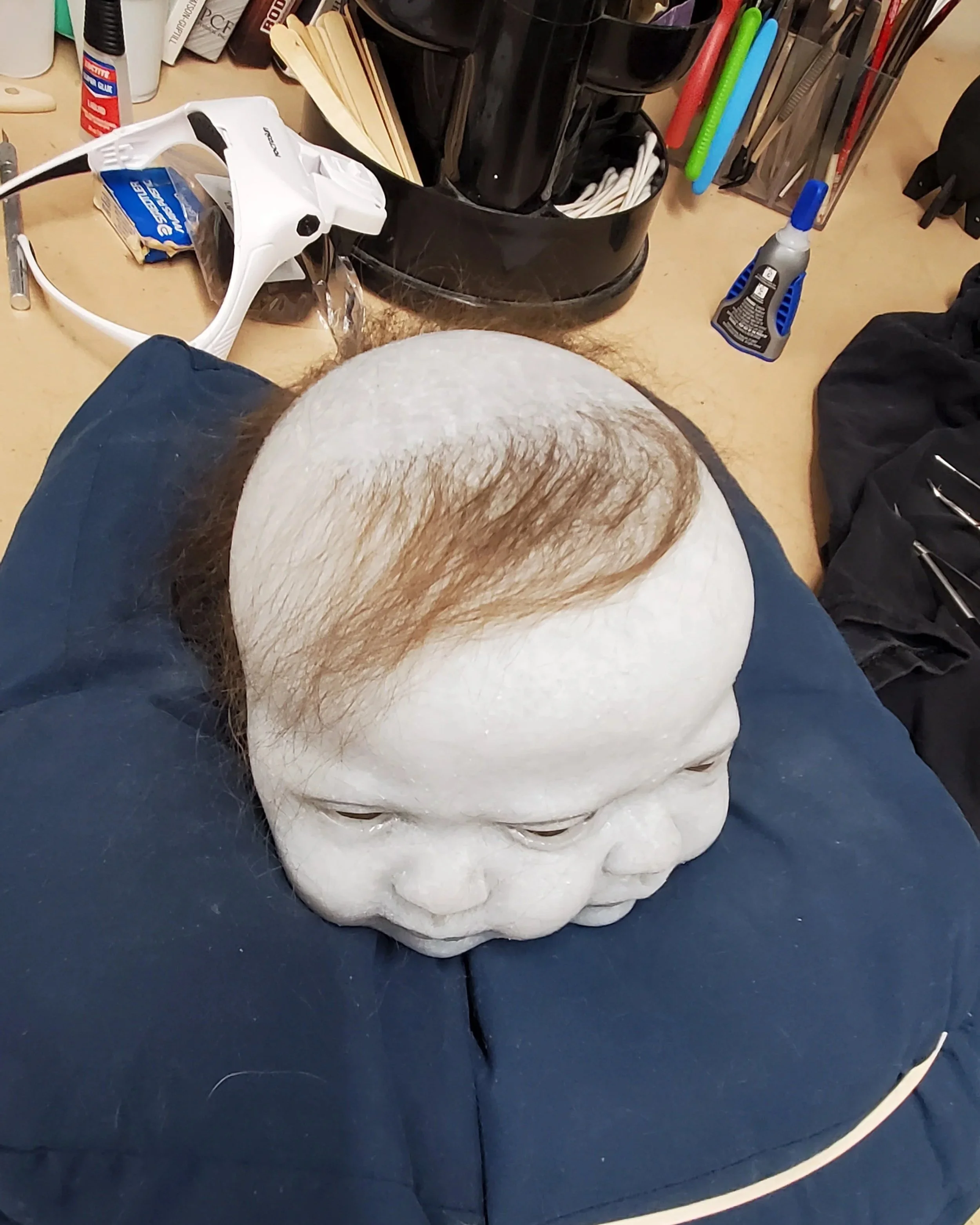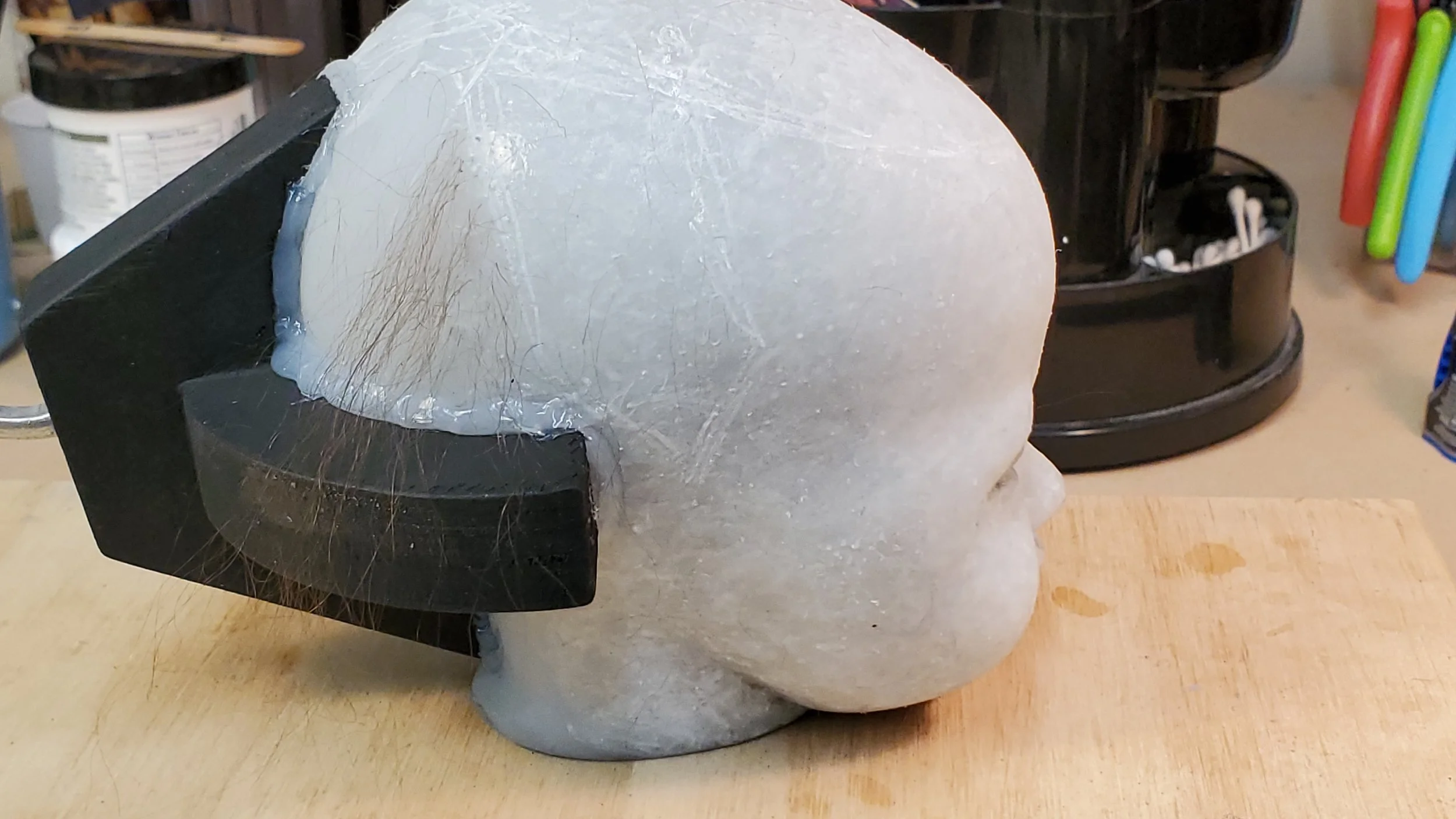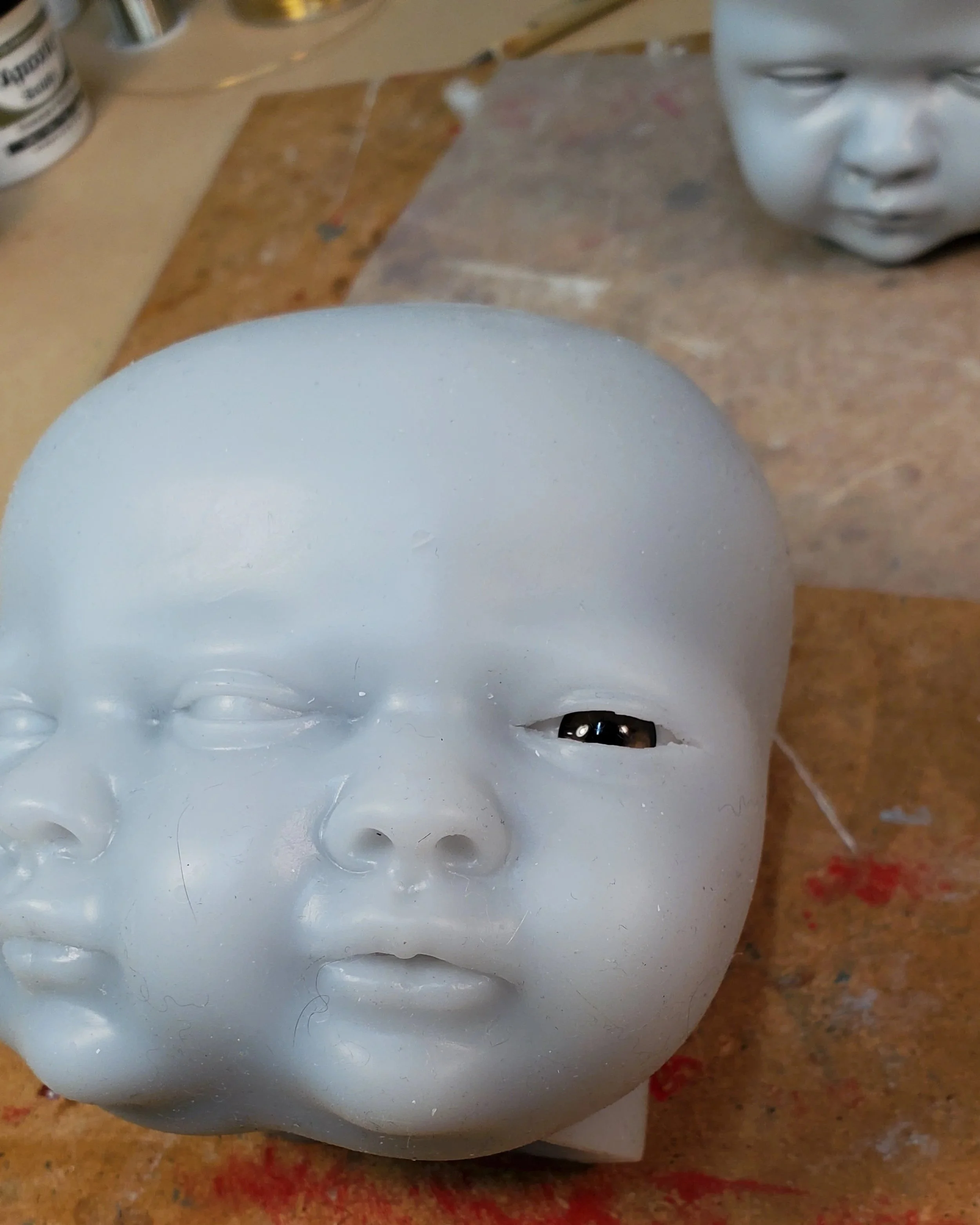 Pockets for the acrylic eyes were carefully cut out of the silicone head.