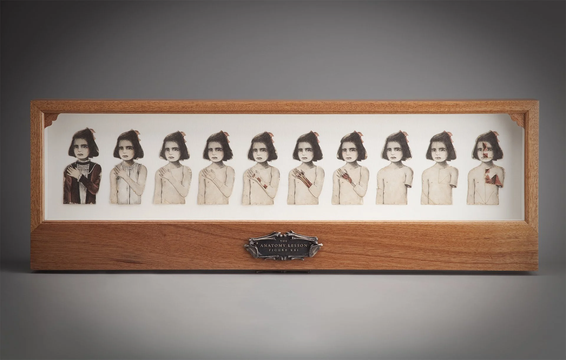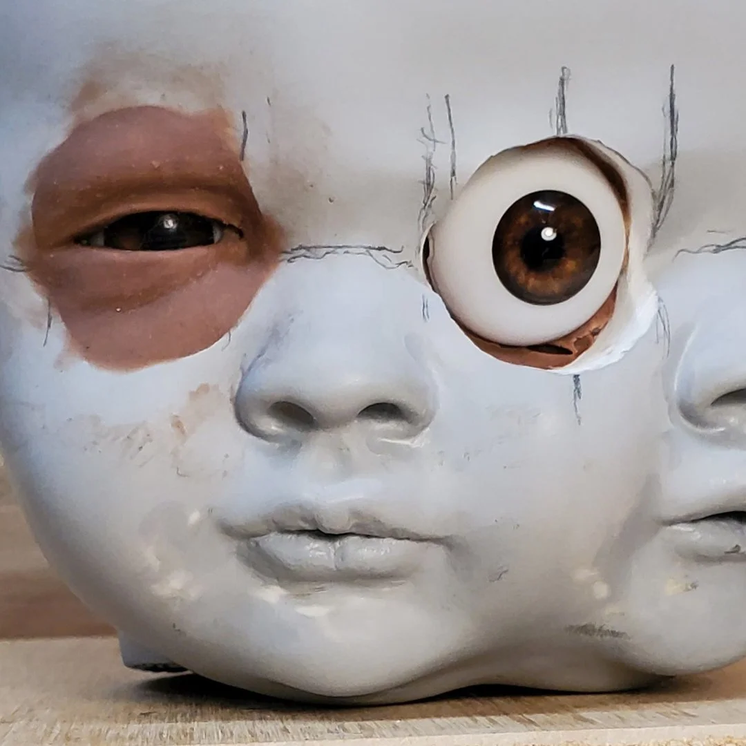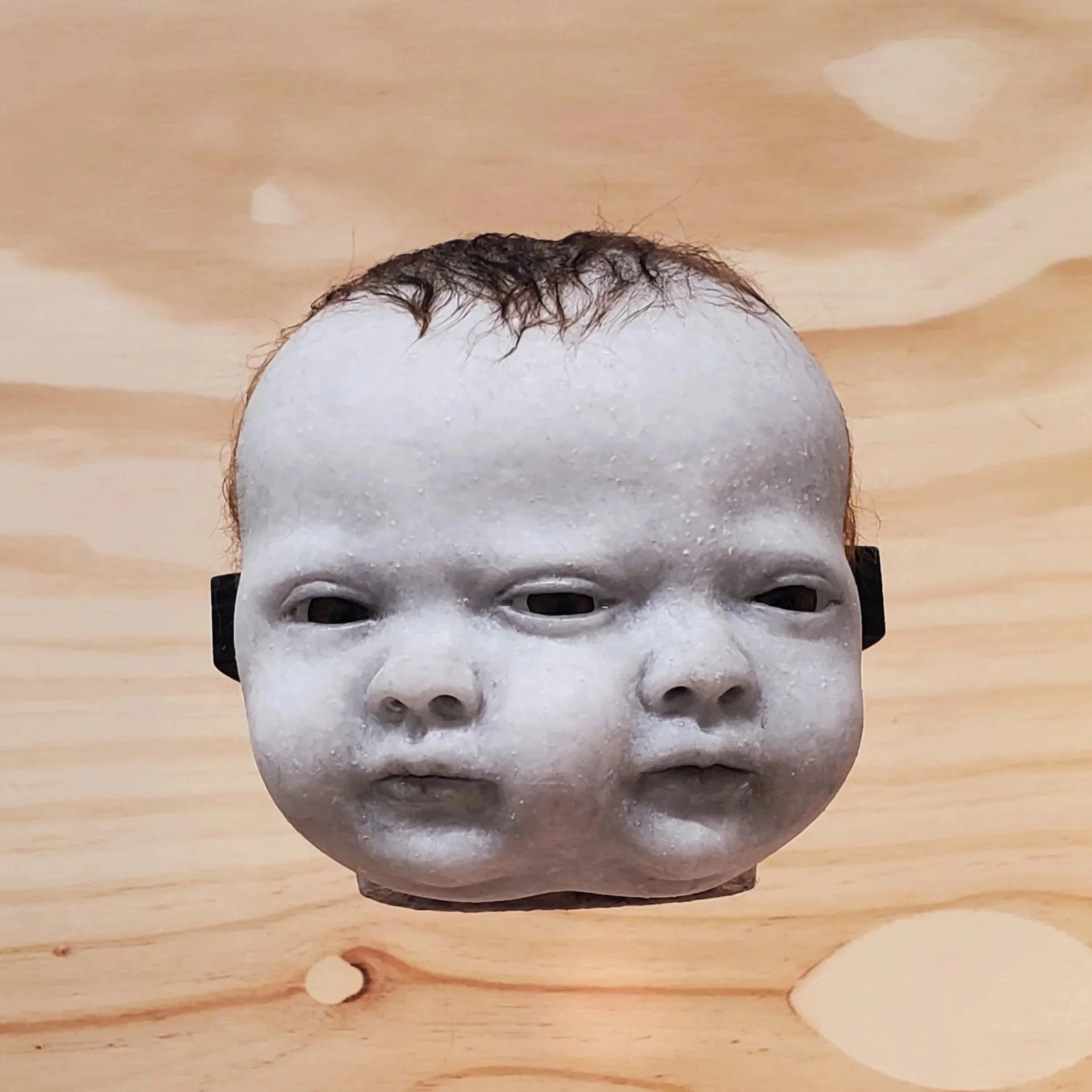 The head was fabricated out of joined and resculpted resin pours from molds from my 2013-2015 sculpture, Ossis Fateor Memoria. After sculpting with epoxy clay was finished, the head was primed and sanded smooth repeatedly. A magnetic pocket in the neck accepted the plate with the neck anatomy and veins. Although I am making my own eyes now, at this time I purchased acrylic doll eyes for the sculpture. Holes were drilled into the resin sculpt and the eyes carefully set into position.