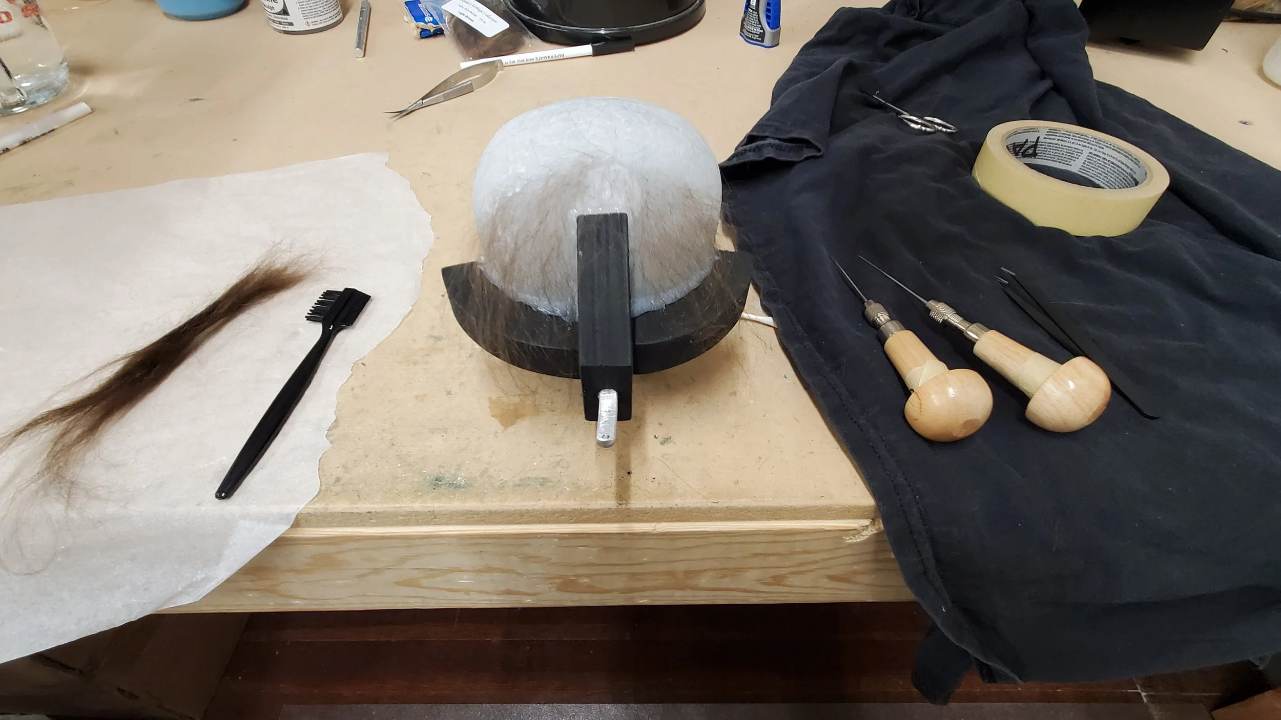 Rooting hair began after a head harness was attached to the back of the head, enabling me to hang the piece securely for photographing and have something to attach flowers to later.