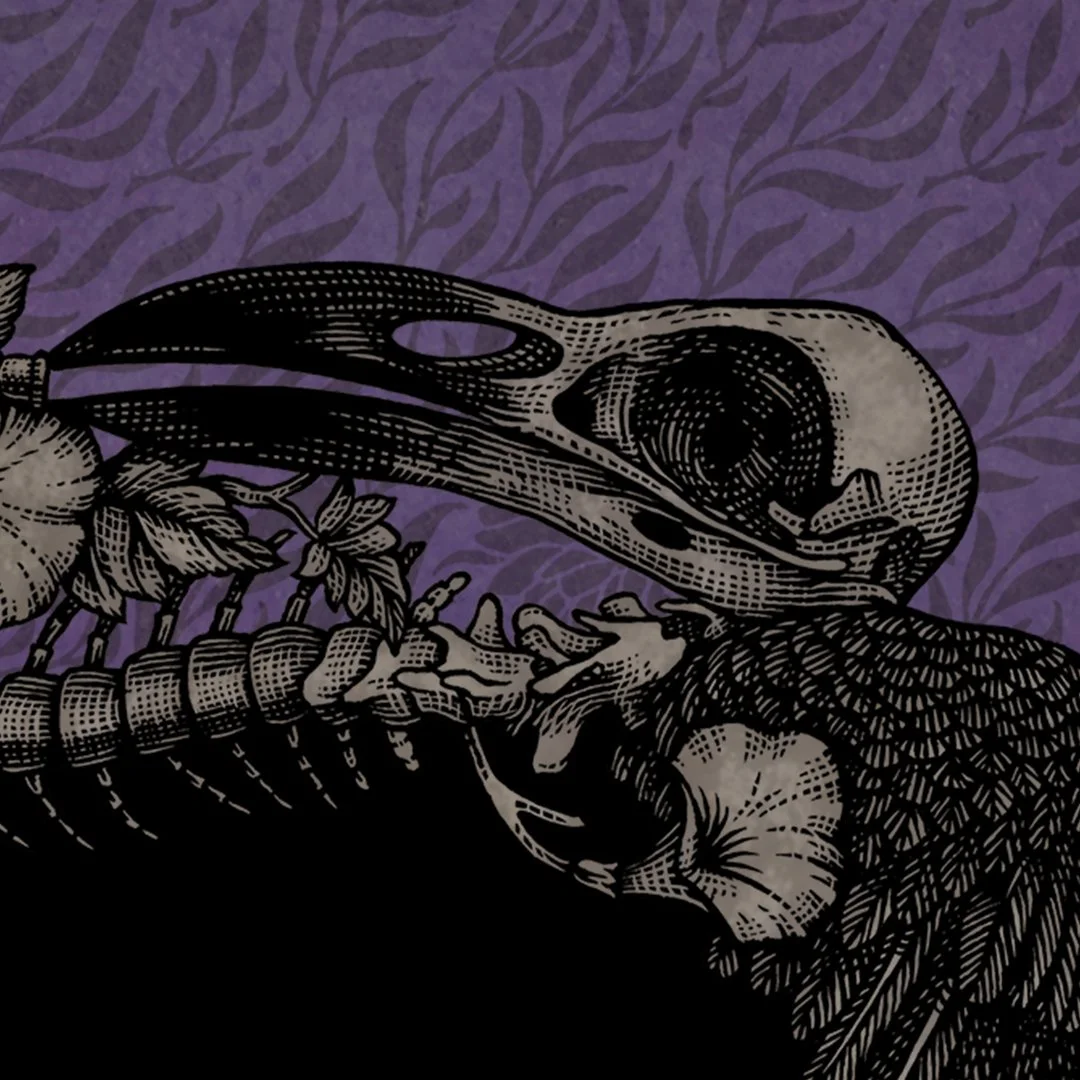 Pygmylush, TOTEM. Album cover for LP, CD, and CS. 2025. Tintype illustration of an original sculpture. Taxidermy raven, resin, epoxy clay, acrylic paint, fresh and dried flowers. Released by Persistent Vision Records.